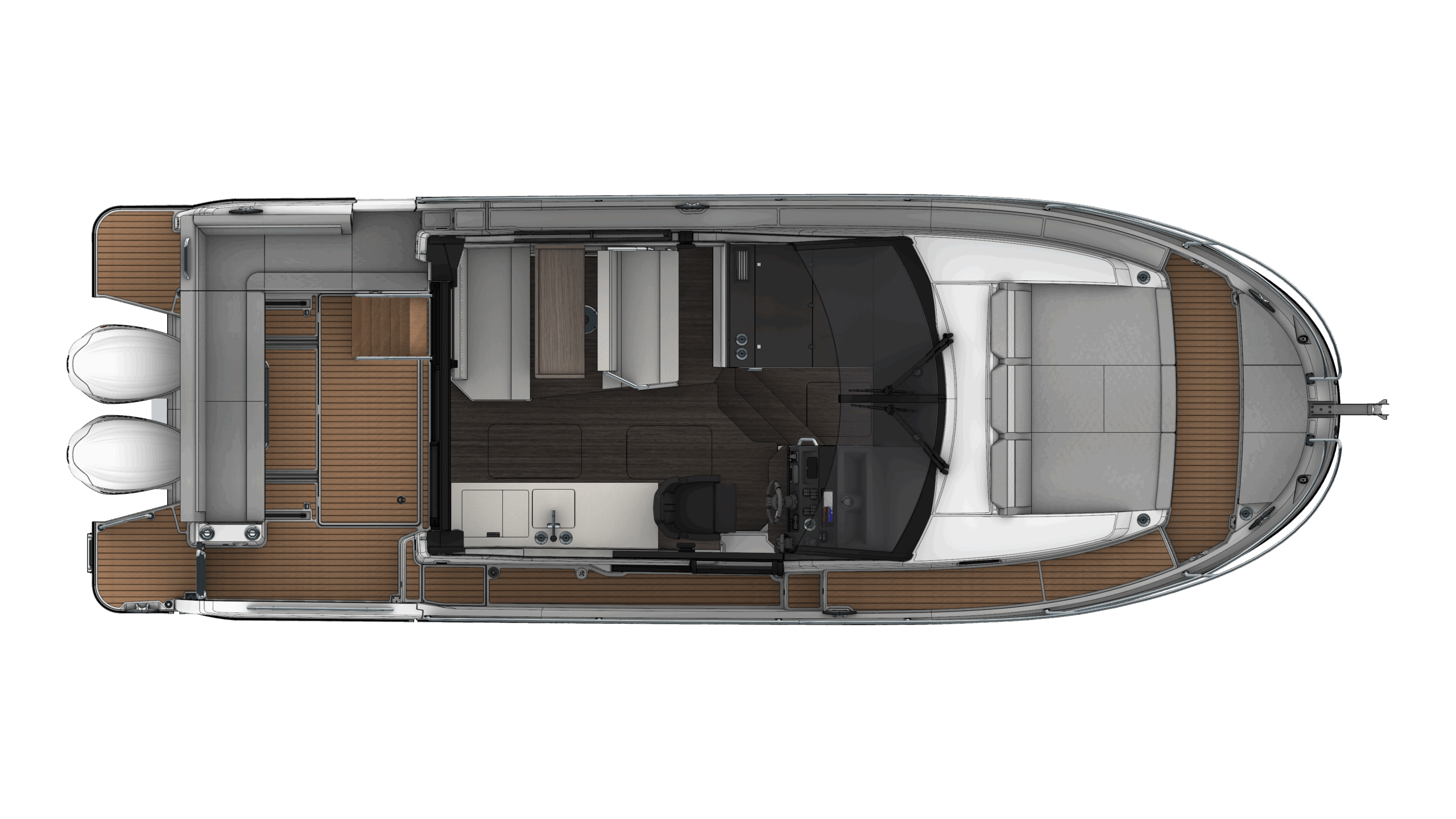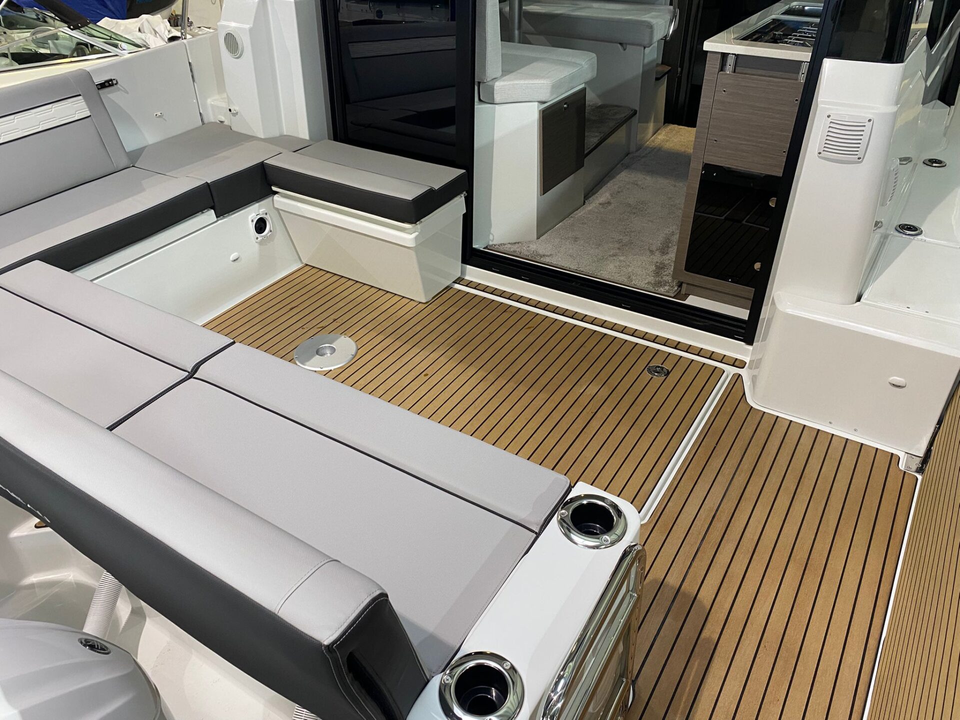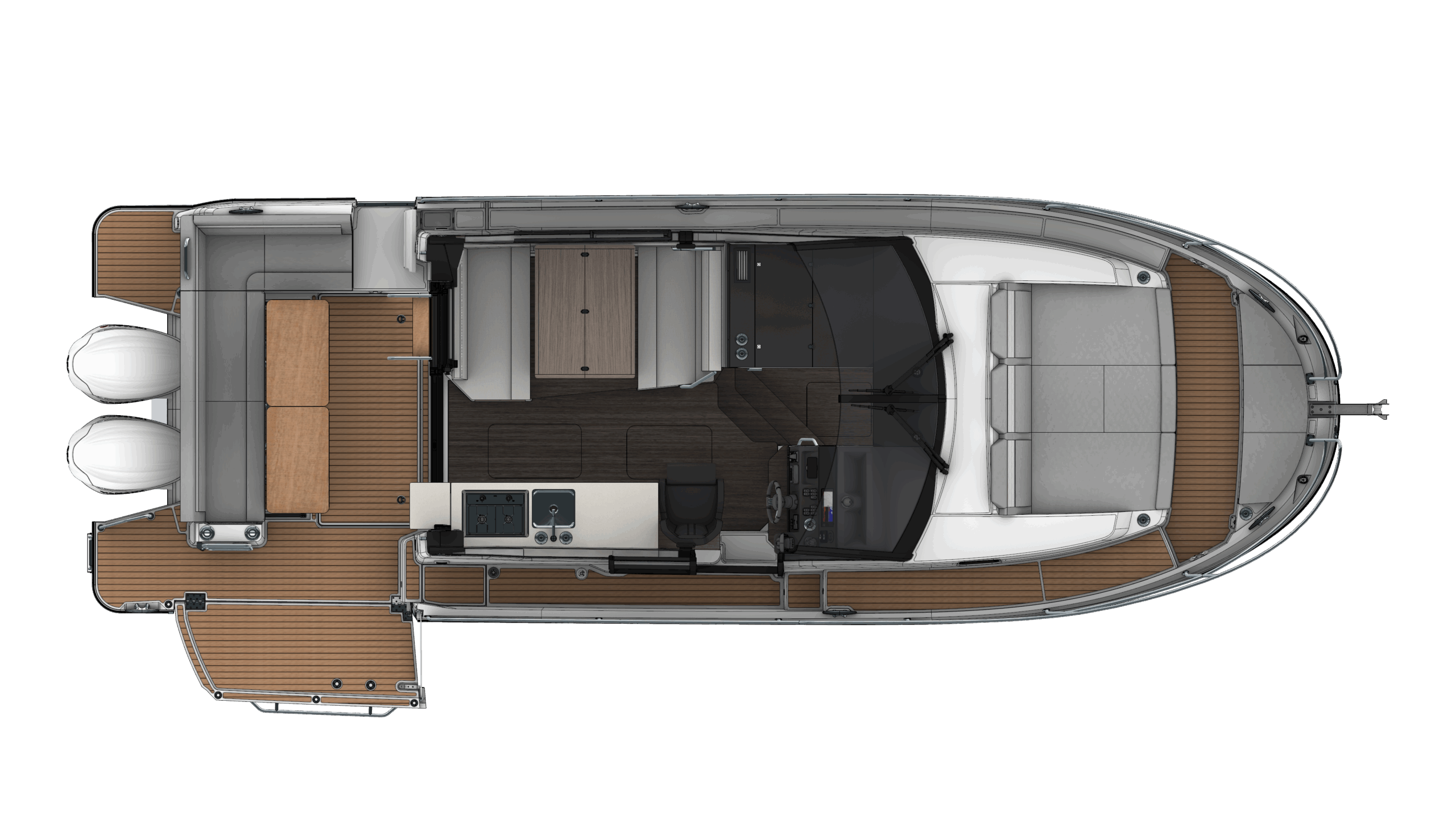 - Trim Level Premiere Paket: Elektrische Ankerwinde, Cockpit Dusche, Ambiance LED indirekte Beleuchtung, LED Cockpitbeleuchtung, Elektrische Trimmklappen Lenco, 230 V Warmwasserbolier, Innengardinen, 2 Cockpitstrahler, Angelrutenhalter