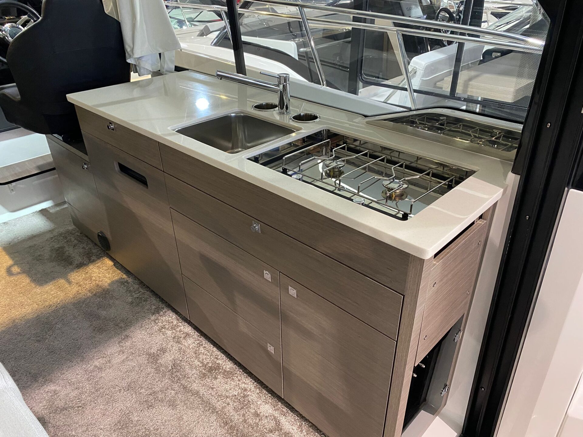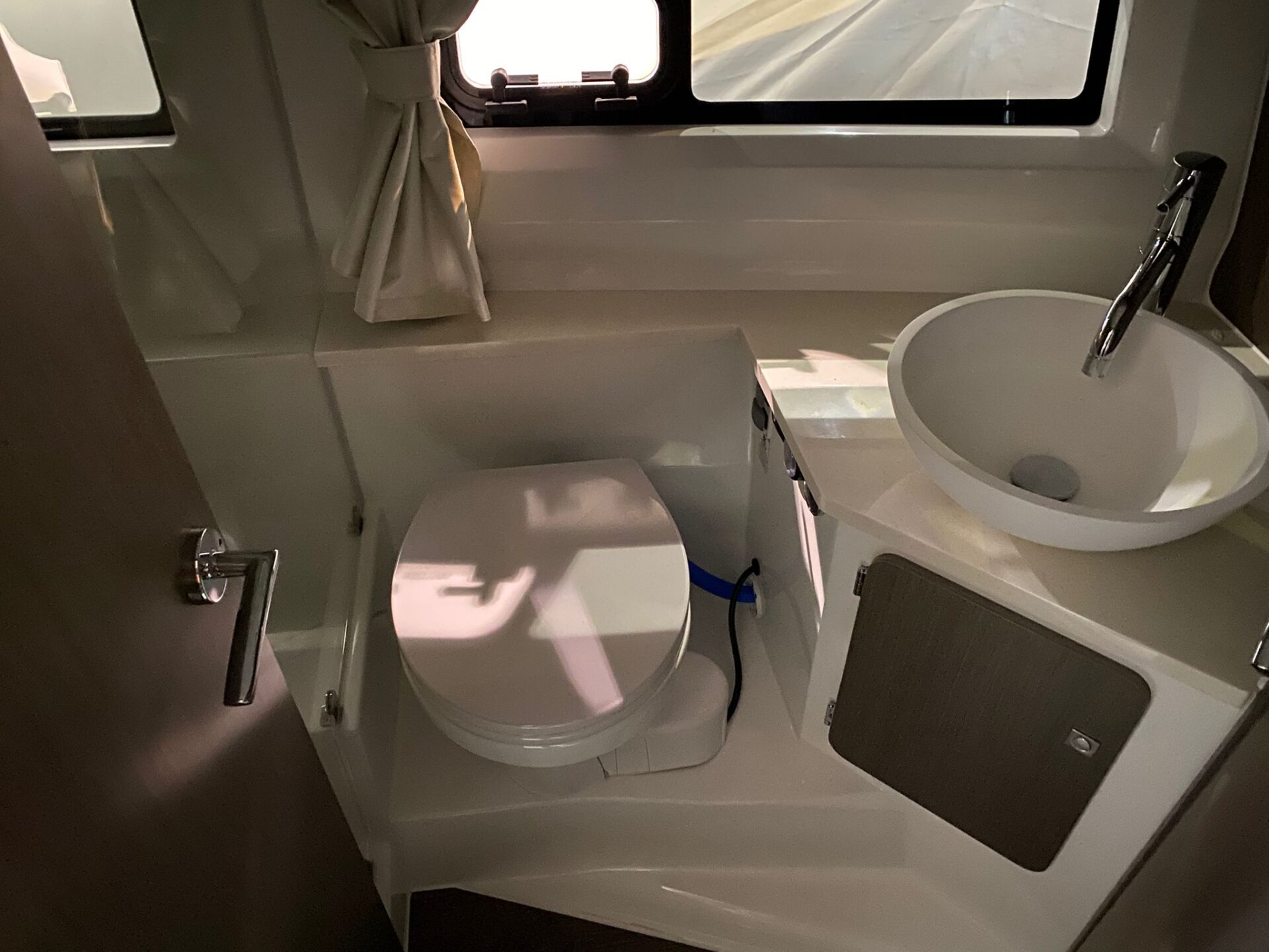 - Komfort Paket 220V – 50 HZ: Elektrische Frischwassertoilette, Frischwasserdirektaufnahme, Steuerung Ankerwinde vom Steuerstand, Waschbecken und Kocher in der Pantry