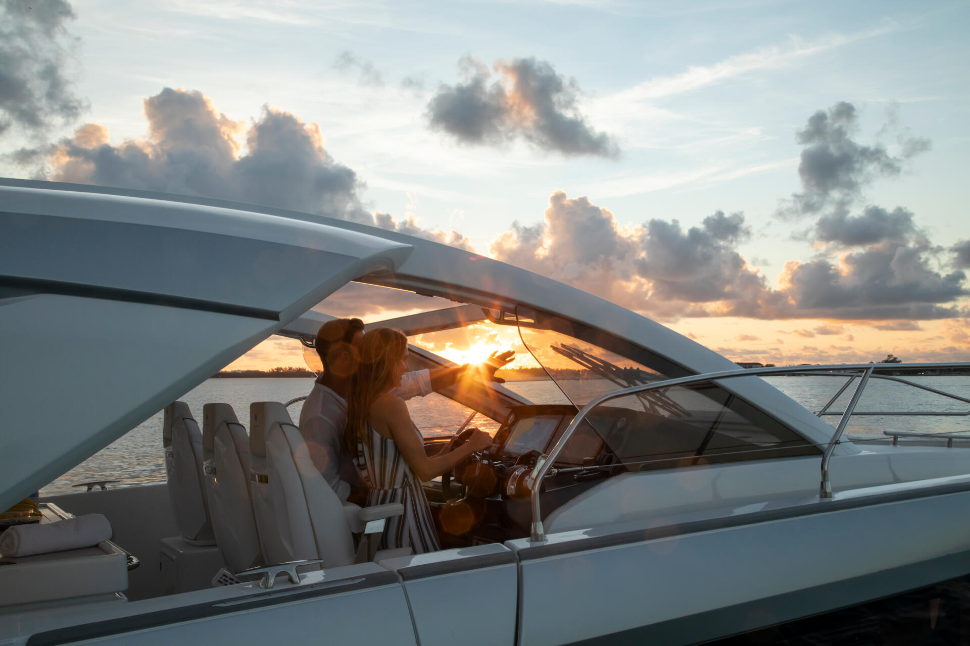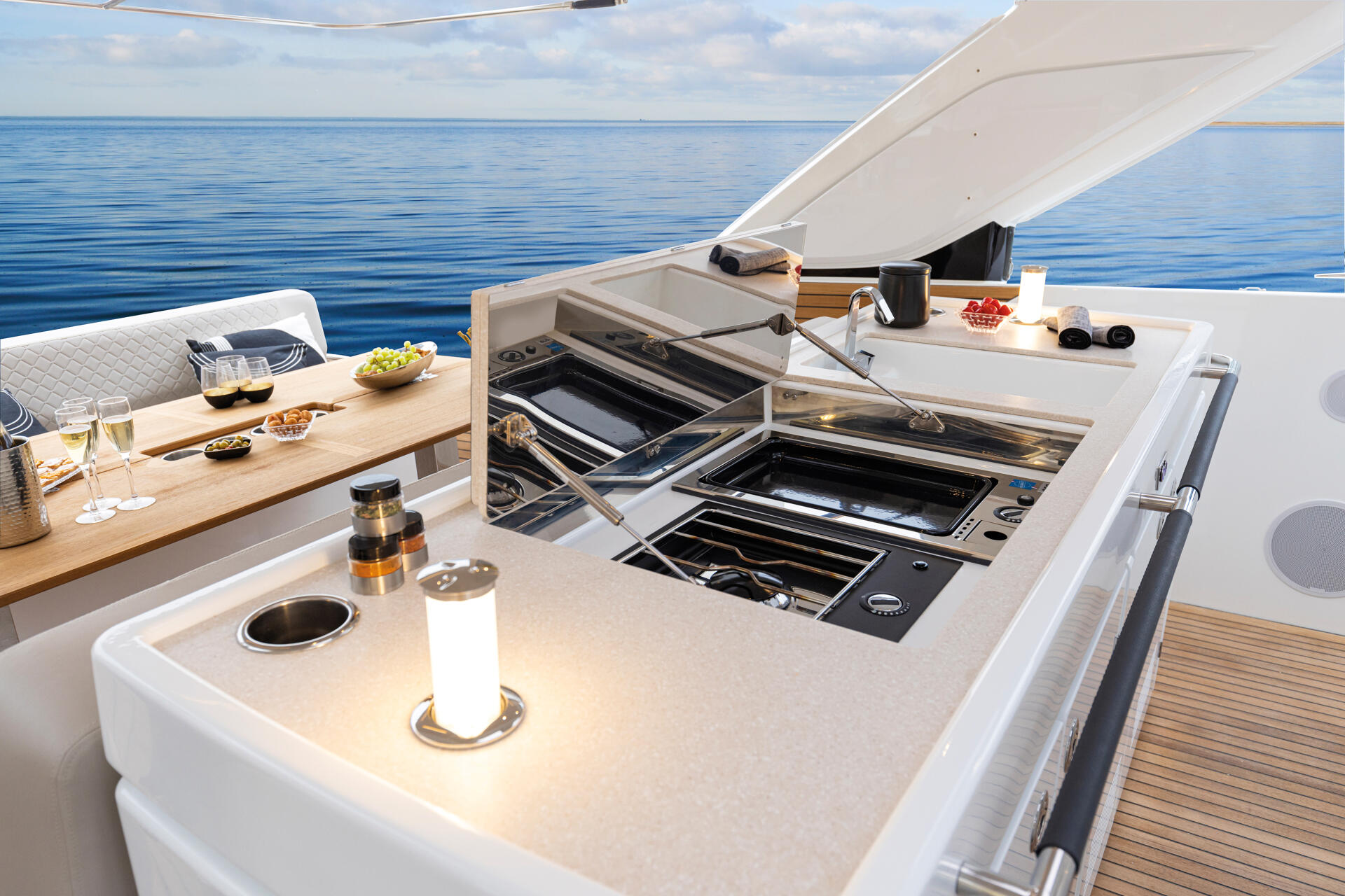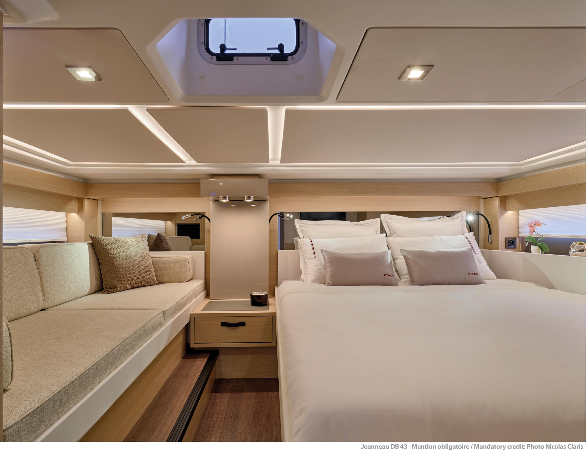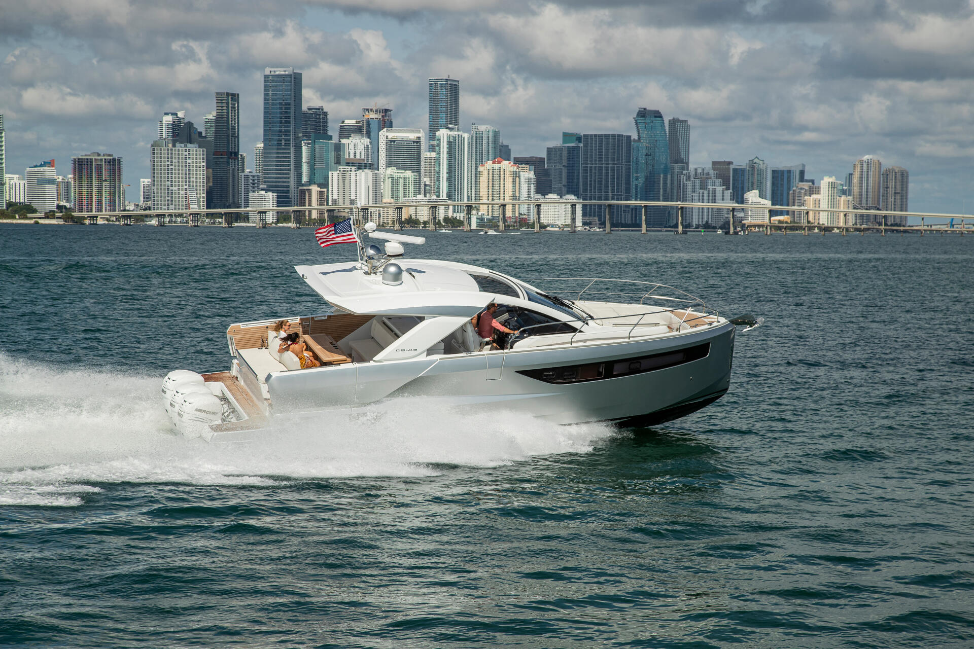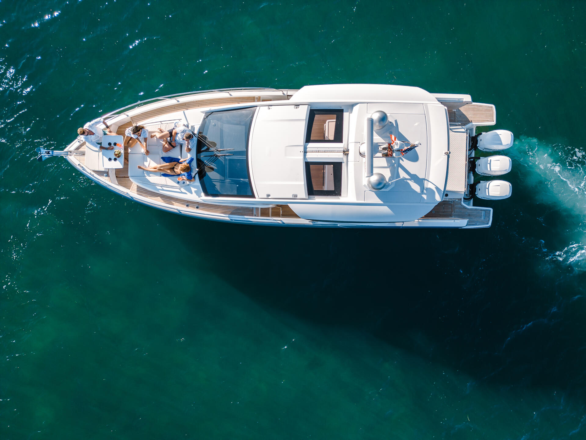 Entdecken Sie die DB/43 OB, ein luxuriöses Boot für bis zu zwölf Personen. Die beiden Seitenterrassen verwandeln sich in Sekundenschnelle in eine offene Heckplattform zum Meer hin. Genießen Sie den Wohnbereich im Cockpit mit einer inselförmigen Küche und Bar. Die Eignerkabine und die Gästekabine bieten geräumigen Komfort für bis zu fünf Personen. Schaffen Sie unvergessliche Erinnerungen auf dem großzügigen Deck, unter der Sonne oder unter dem Sternenhimmel. Als Außenborder bietet die DB/43 OB eine Dreifachmotorisierung von Yamaha oder Mercury. Mit ausklappbaren Badeplattformen, einem Coupé Hardtop, einer komplett ausgestatteten Küche, einer Sonnenliege, einer Nasszelle und einer wandelbaren Hecksitzgruppe ist die DB/43 OB bereit für Abenteuer auf dem Meer.